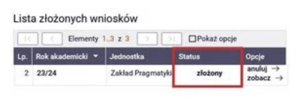 Wygląd złożonego wniosku w USOSweb.